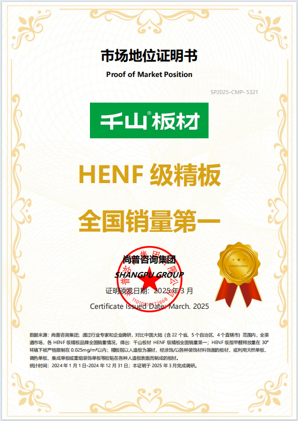 千山實力,權(quán)威認(rèn)證! 千山板材獲頒“HENF級精板全國銷量第一”認(rèn)證證書
