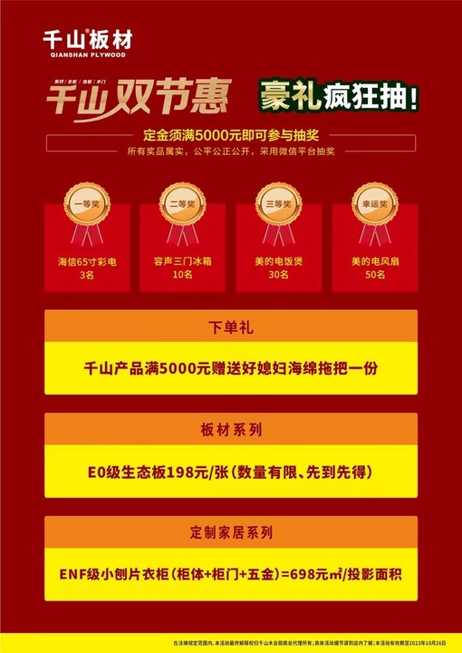 2023年9月26日,千山板材第五屆雙節(jié)惠暨千山板材新品發(fā)布會在江西省贛州市火爆開啟!活動時間長達一個月,工廠直供,產(chǎn)品質量優(yōu)異,價格實打實優(yōu)惠!本次活動不僅為消費者提供了勁爆的優(yōu)惠政策,更是奉上了一系列驚喜豪禮與真摯服務。