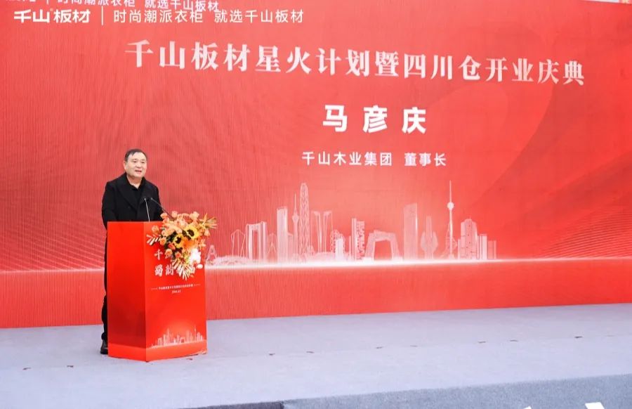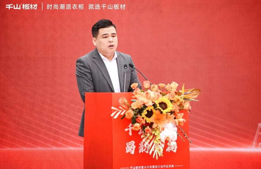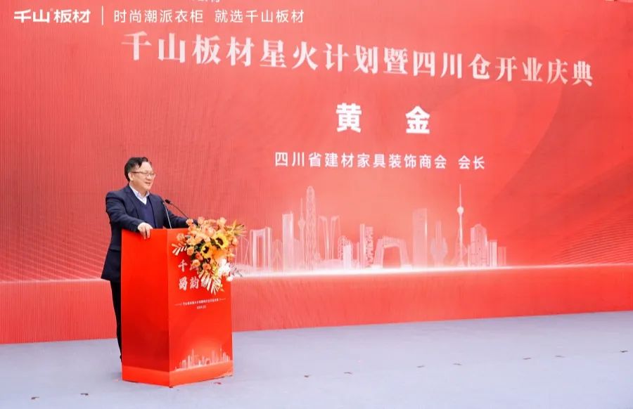 四川省建材家具裝飾商會會長黃金先生發(fā)表致辭。黃會長表達了對千山板材四川倉的美好期許和祝愿,并表示四川家具市場的繁榮與發(fā)展,離不開千山板材等一眾優(yōu)秀供應鏈品牌的入駐與支持,也希望四川倉合力共上,迎來高質量發(fā)展。