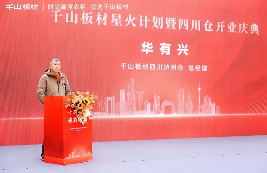 千山板材優(yōu)秀經(jīng)銷商代表,四川瀘州倉總經(jīng)理華有興上臺致辭。華總分享到,在集團總部和區(qū)域合作伙伴的支持與努力下,千山板材在瀘州地區(qū)的市場占有率逐年攀升,品牌影響力日益增強。未來,將繼續(xù)加強合作,共同應對市場挑戰(zhàn),實現(xiàn)互利共贏。