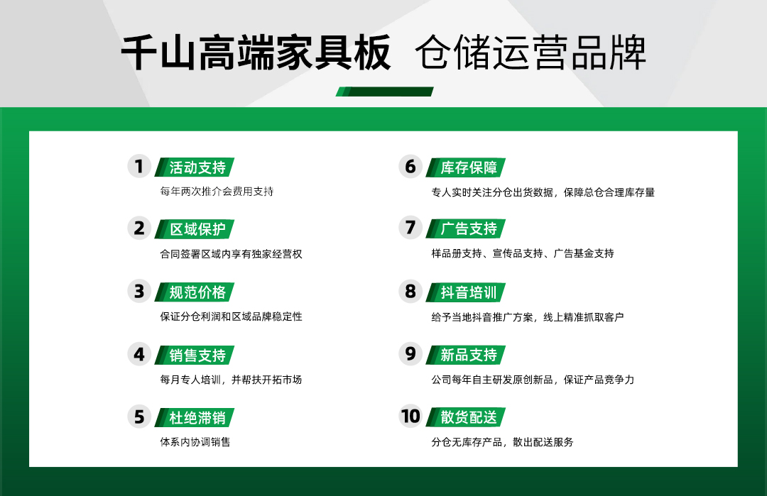 “讓更多家庭擁有健康生活”是千山始終不變的初心與使命。在如今的新趨勢下,千山將繼續(xù)專注品質(zhì)追求,不斷技術(shù)創(chuàng)新,提升服務(wù)質(zhì)量,并積極擁抱更多的合作伙伴。2022千山家具板倉儲全國招商正式開啟,誠邀加盟!