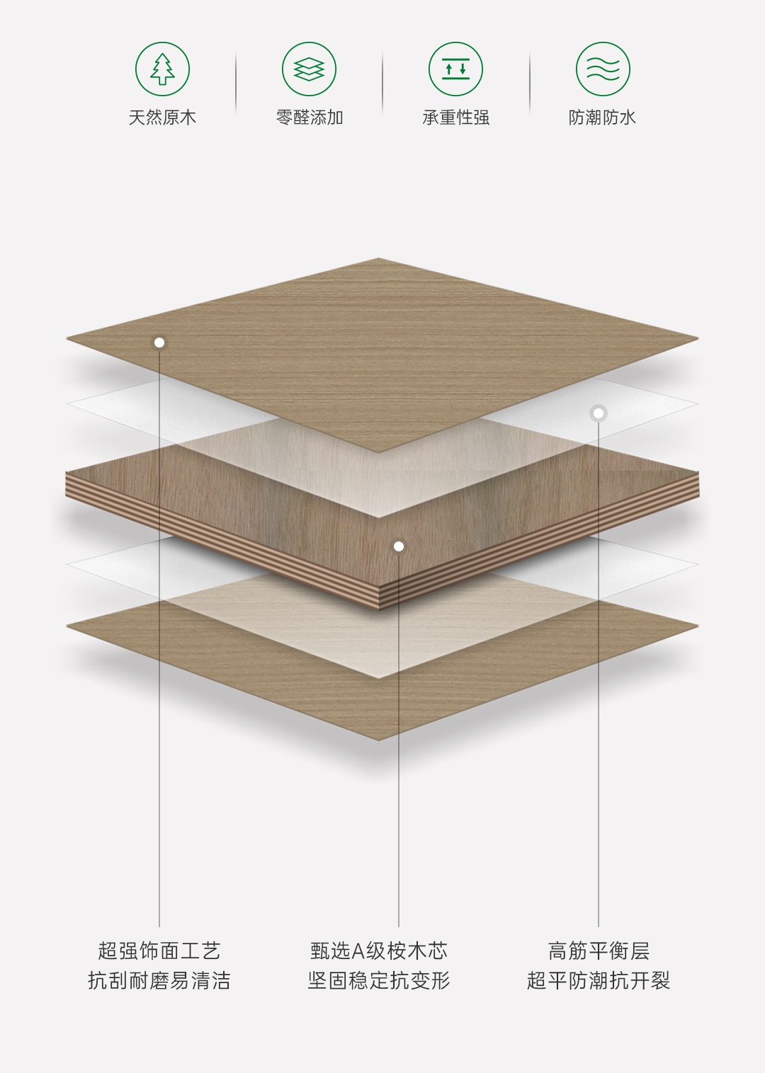 千山阻燃家具板甄選優(yōu)質(zhì)原木,確保成品板材的密度均勻,硬度更高,握釘力更強(qiáng)。內(nèi)芯11層結(jié)構(gòu),加厚單板縱橫交錯鋪裝,保證板材的穩(wěn)定性能,膠合強(qiáng)度更高,使板材的抗壓性、承重力更為出色。優(yōu)質(zhì)基材經(jīng)過全周期養(yǎng)生、篩選、烘干、熱壓、砂光等24道標(biāo)準(zhǔn)工藝,并通過吸水膨脹率、耐濕、內(nèi)結(jié)合強(qiáng)度等多項專業(yè)檢測,防潮抗變形,品質(zhì)更出眾。