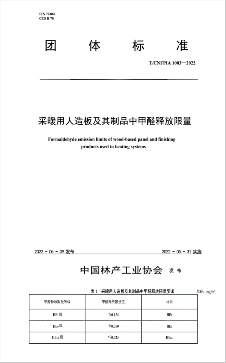 2022年5月31日開始實(shí)施的T/CNFPIA1003—2022《采暖用人造板及其制品中甲醛釋放限量》文件,對甲醛釋放量有三個分級,分別為HE1(≤0.124mg/m3)、HE0(≤0.050mg/m3)、HENF(≤0.025mg/m3)。