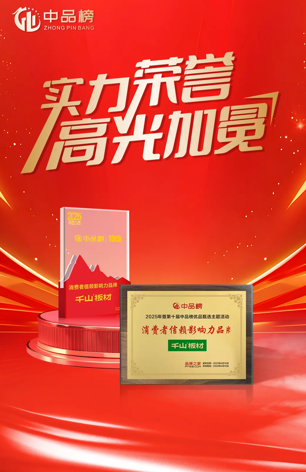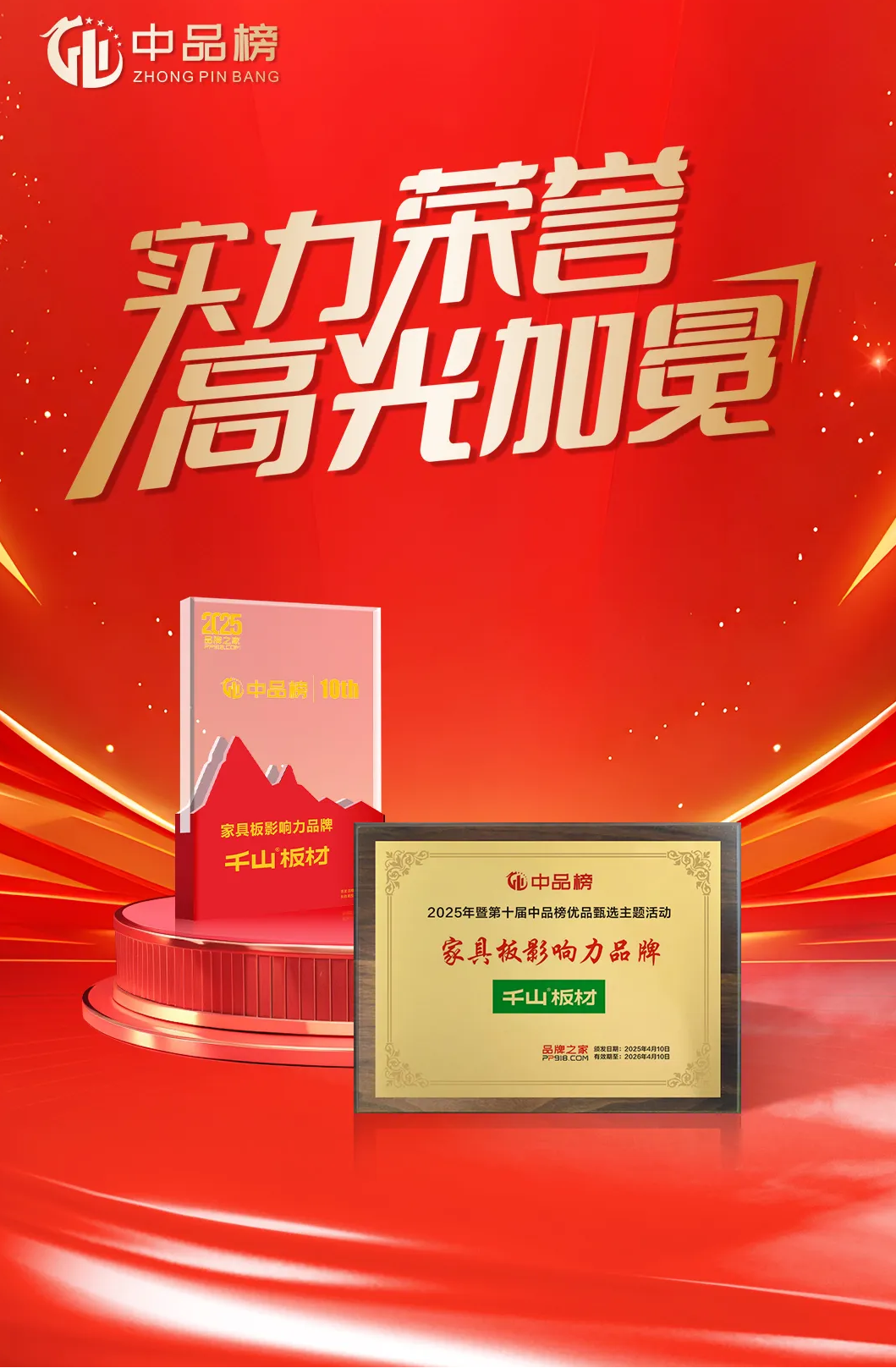 2025年4月,歷時(shí)三個(gè)多月的第十屆“中品榜”優(yōu)品甄選活動(dòng)圓滿落幕,板材大品牌榜單正式揭曉!千山板材憑借卓越產(chǎn)品力和強(qiáng)大市場(chǎng)表現(xiàn)力,再次成為行業(yè)焦點(diǎn),斬獲四項(xiàng)重量級(jí)大獎(jiǎng):“板材十大品牌”、“環(huán)保板材十大品牌”、“家具板十大品牌”、“消費(fèi)者信賴十大品牌”。