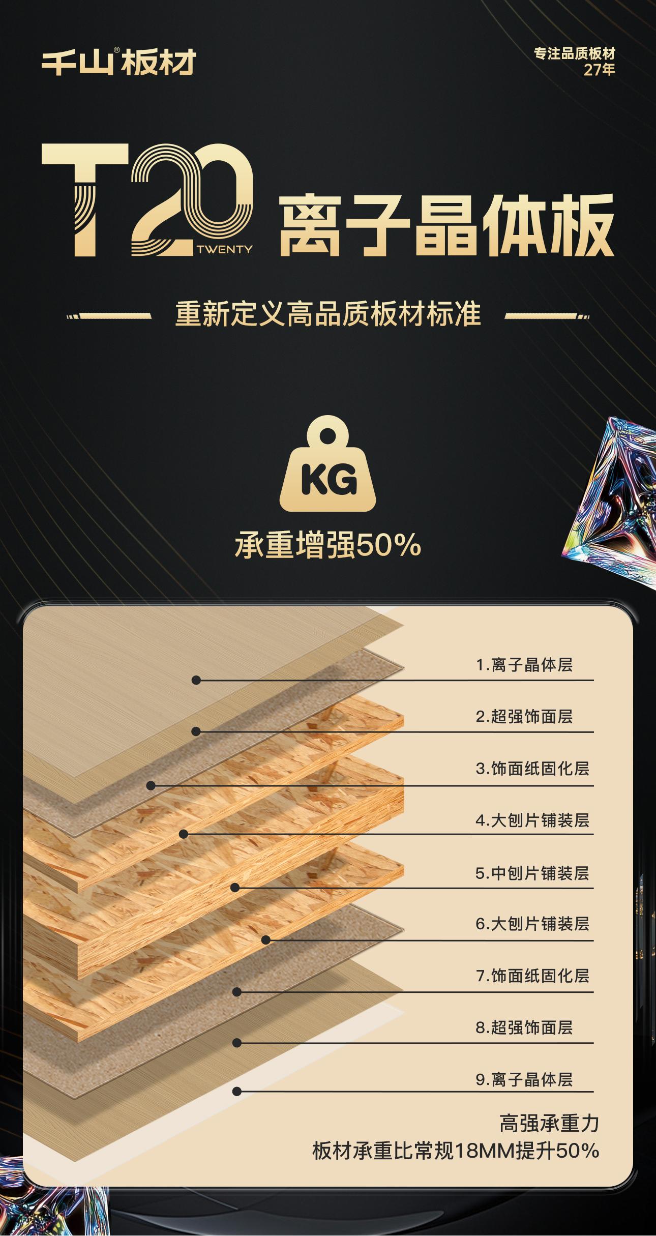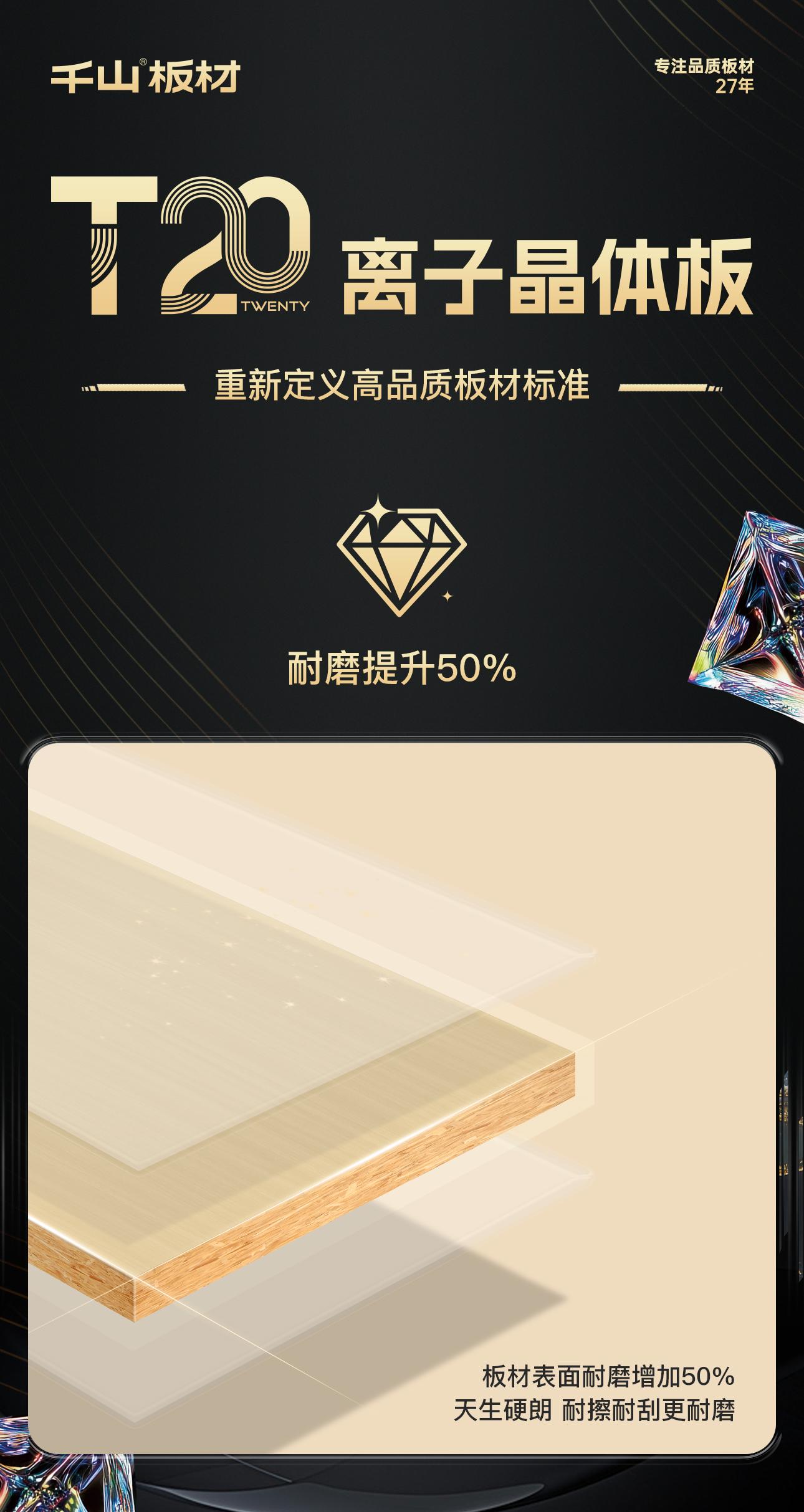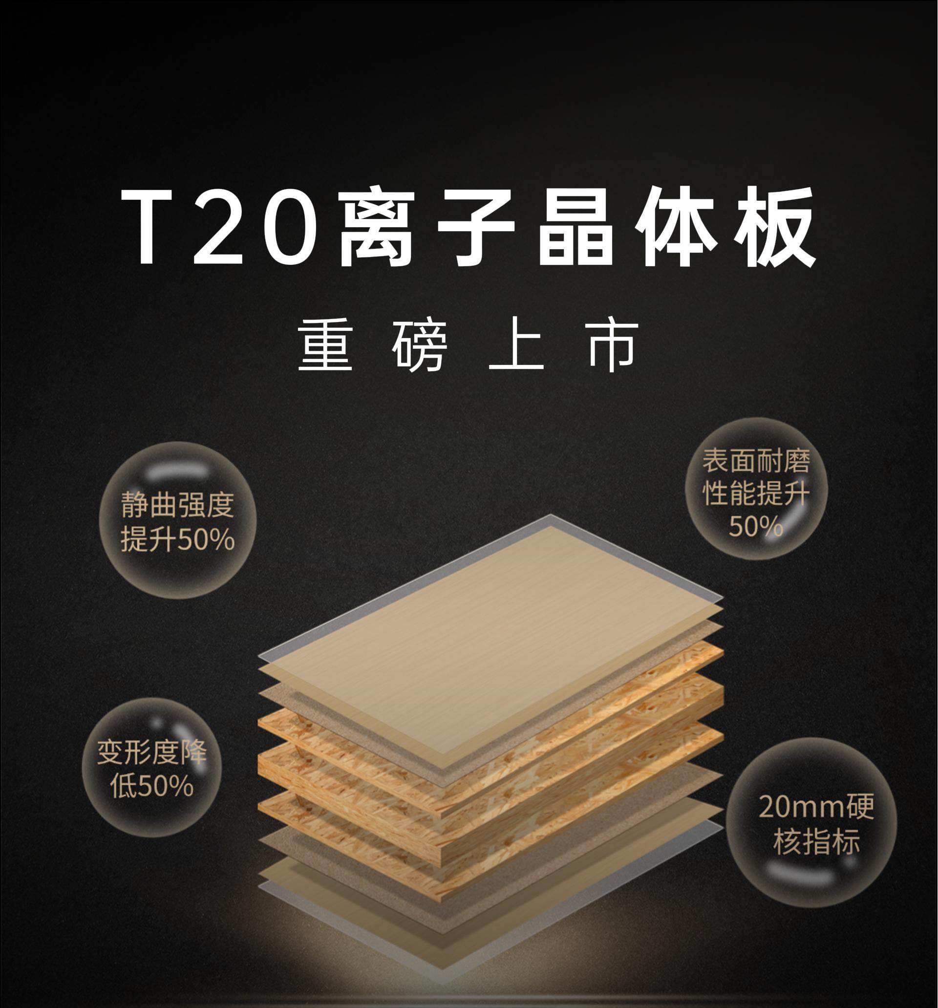 千山板材重磅推出T20離子晶體板,以20mm厚度、高強(qiáng)承重、高能抗變形、超強(qiáng)耐磨的優(yōu)異性能,顛覆傳統(tǒng)門板的性能界限,重新定義高品質(zhì)板材標(biāo)準(zhǔn),實(shí)現(xiàn)產(chǎn)品穩(wěn)定性與空間美觀性的極致效果,成就柜體柜門通配、一門到頂?shù)某軕?yīng)用。