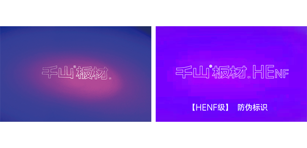 千山板材每張板材表面都印有隱形防偽標(biāo)識(shí),使用紫光手電筒照射板材表面,HENF級(jí)板材顯現(xiàn)“千山板材HENF”;ENF級(jí)和E0級(jí)板材顯現(xiàn)“千山板材”。